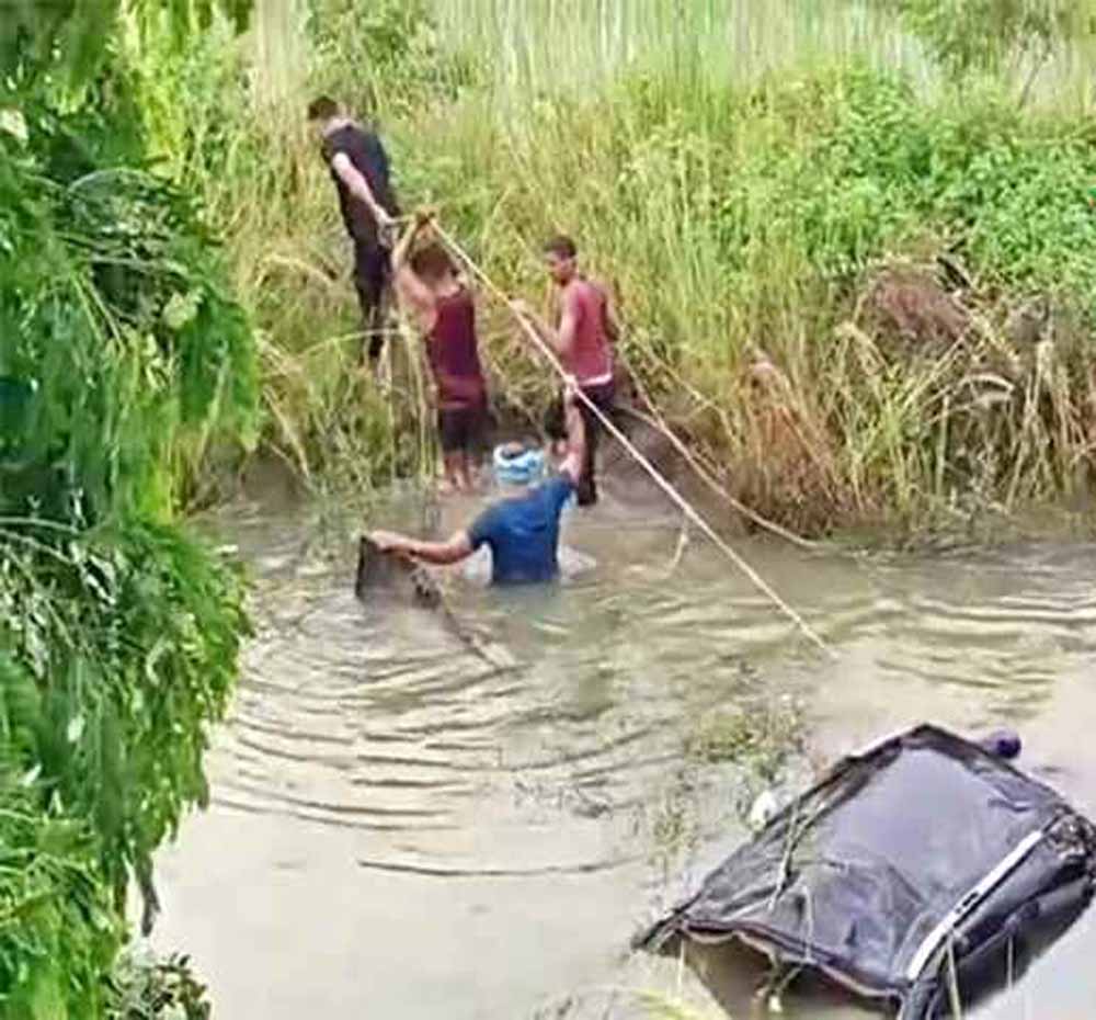 पानी भरे गड्ढे में गिरी कार