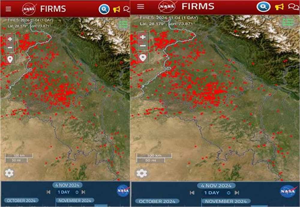 हरियाणा सरकार की ओर से पिछले कुछ वर्षों में किसानों के लिए पराली प्रबंधन को लेकर कई योजनाएं और जागरूकता अभियान चलाए गए हैं। नासा की आधिकारिक वेबसाइट पर 4 और 5 नवंबर के एक्टिव फायर डेटा की तस्वीरों ने हरियाणा के पराली प्रबंधन की एक सकारात्मक तस्वीर पेश की है। इस बार भी हरियाणा में पराली जलाने के मामले पड़ोसी राज्यों के मुकाबले लगभग दो-तिहाई कम दर्ज किए गए हैं। नासा की इन तस्वीरों में हरियाणा में पराली जलाने के बेहद कम केस स्पष्ट रूप से देखे जा सकते हैं।