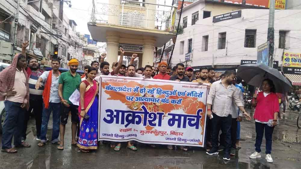 मुजफ्फरपुर में हिंदूवादी संगठन ने बांग्लादेश में अल्पसंख्यक हिंदू समुदाय पर हो रहे अत्याचार और हिंदू मंदिरों को निशाना बनाए जाने के खिलाफ विरोध मार्च निकाला। यह पैदल मार्च शहर के खुदीराम बोस स्थल से सरैयागंज टावर तक निकाला गया। इस दौरान मार्च में शामिल लोगों ने हिंदुओं की रक्षा सुनिश्चित कराने की मांग की।