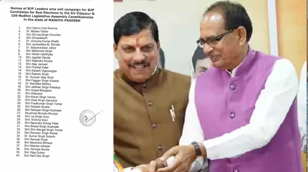 इस लिस्ट में प्रदेश अध्यक्ष वीडी शर्मा, मुख्यमंत्री डॉ. मोहन यादव ,केंद्रीय मंत्री शिवराज सिंह चौहान,ज्योतिरादित्य सिंधिया समेत पार्टी के कई दिग्गज नेता प्रचार करेंगे. बुधनी और विजयपुर उपचुना को लेकर कार्यकर्ता में जोश भरेंगे.