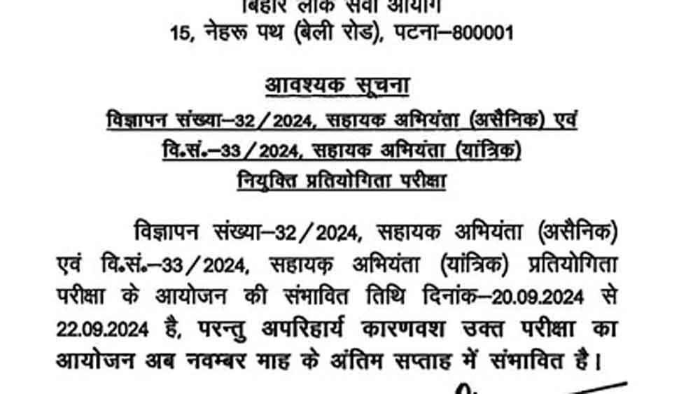आयोग से अधिसूचना में कहा है कि परीक्षा नवंबर में होने की संभावना है। इससे पहले यह परीक्षा 20 से 22 सितंबर, 2024 तक आयोजित होने वाली थी। भर्ती अभियान का उद्देश्य कुल 118 रिक्तियों को भरना है, जिनमें से 113 रिक्तियां सहायक अभियंता (सिविल) के पद के लिए और 5 सहायक अभियंता (मैकेनिकल) के पद के लिए हैं। आयोग ने नोटिस जारी करते हुए कहा, कि अपरिहार्य कारणों से स्थगित कर दी है। अधिसूचना के अनुसार, परीक्षा नवंबर 2024 के अंतिम सप्ताह में आयोजित होने की संभावना है।