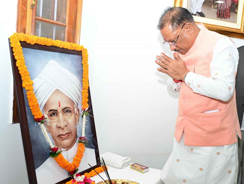 मुख्यमंत्री श्री विष्णु देव साय ने आज यहाँ अपने निवास कार्यालय में पूर्व राष्ट्रपति भारतरत्न डॉ. सर्वपल्ली राधाकृष्णन की जयंती के अवसर पर उनके छायाचित्र पर पुष्प अर्पित कर उन्हें नमन किया। उन्होंने शिक्षक दिवस के अवसर पर सभी शिक्षकों और प्रदेशवासियों को बधाई एवं शुभकामनाएं दी। मुख्यमंत्री ने इस दौरान अपने सभी गुरुओं का स्मरण किया।