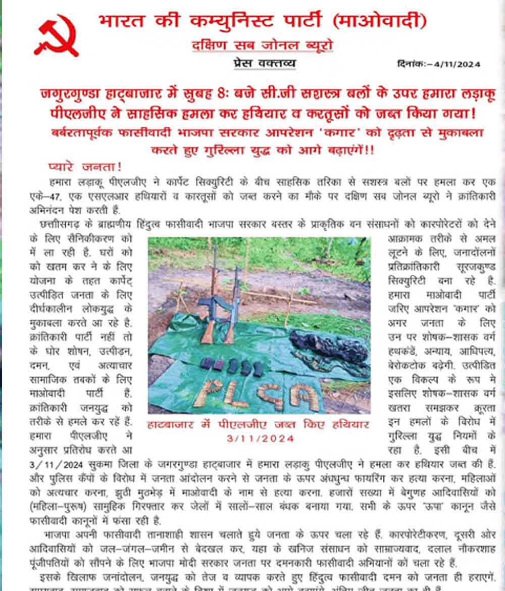 बताया जा रहा है कि बीते रविवार को सुकमा जिले के जगरगुंडा साप्ताहिक बाजार की ड्यूटी में तैनात जवानों पर नक्सलियों ने हमला करते हुए उनके पास रखे हथियार को लूट कर फरार हो गए, जवानों पर हुए अचानक से हमले के बाद बाजार में दहशत फैल गई। घटना के तत्काल बाद जहां घायलों को अस्पताल ले जाया गया। वहीं बाजार में शांति देखी गई। आसपास के लोगों का कहना था कि बाजार में ड्यूटी कर रहे दो जवानों पर नक्सलियों की स्माल एक्शन टीम ने हमला कर दिया। हमले में दो जवान घायल हुए, जिन्हें जगरगुंडा अस्पताल में इलाज के लिए ले जाया गया। बाजार में घटना के बाद अफरा तफरी होते ही पुलिस ने इलाके को घेर लिया। घटना के 24 घंटे के बाद दक्षिण सब जोनल ब्यूरो के प्रवक्ता समता ने प्रेस नोट जारी किया। बता दें कि इस घटना को नक्सलियों की पीएलजीए के लड़ाकुओं ने आठ बजे अंजाम दिया। जिसके बाद हथियार को लूट कर ले गए। नक्सलियों ने लुटे हुए हथियार की फोटो भी जारी की है।