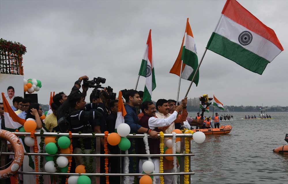 मुख्यमंत्री डॉ मोहन यादव ने वॉटर स्पोर्ट्स तिरंगा शो के अंतर्गत बड़े तालाब पर लेक प्रिंसेस क्रूज में ध्वज अभिवादन किया और तिरंगे की थीम बैलून छोड़े। वॉटर स्पोर्ट्स खिलाड़ियों द्वारा बड़े तालाब में देश भक्ति की धुनों के बीच तिरंगे के साथ विशेष फॉर्मेशन निर्मित की गई। मुख्यमंत्री डॉ यादव ने पूरे जोश के साथ देशभक्ति गीत ‘यह देश है वीर जवानों का’ गाया और बड़े तालाब में नावों पर सवार नृतक और नृत्यांगनाओं ने गीत की धुन पर नृत्य प्रस्तुत किया।