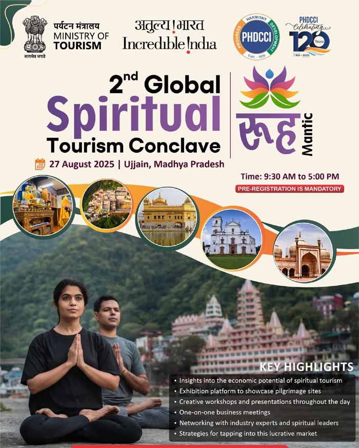 महाकाल की पवित्र नगरी उज्जैन में 27 अगस्त 2025 को प्रदेश के द्वितीय वैश्विक आध्यात्मिक पर्यटन सम्मेलन “रूहmantic” का आयोजन होने जा रहा है। मुख्यमंत्री डॉ. मोहन यादव और केंद्रीय पर्यटन एवं संस्कृति मंत्री श्री गजेंद्र सिंह शेखावत सम्मेलन का शुभारंभ करेंगे। इस अवसर पर आध्यात्मिक पर्यटन पर पीएचडीसीसीआई-केपीएमजी की रिपोर्ट “आस्था और प्रवाह: भारत के पवित्र स्थलों में जनसमहू का मार्गदर्शन” का विमोचन किया जाएगा। आध्यात्मिक गुरु गौरांग दास प्रभु सम्मेलन के मुख्य वक्ता होंगे।