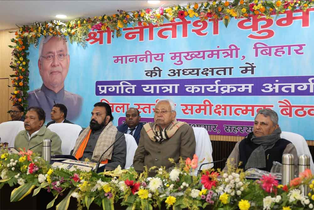 मुख्यमंत्री श्री नीतीश कुमार ने आज प्रगति यात्रा के तीसरे चरण में सहरसा जिले में चल रही विकासात्मक योजनाओं के संबंध मेंप्रमंडलीय सभागार (कोशी प्रमंडल), सहरसा में समीक्षात्मक बैठक की। समीक्षात्मक बैठक में सहरसा के जिलाधिकारी श्री वैभव चौधरी ने जिले के विकासकार्यों का प्रस्तुतीकरण के माध्यम से विस्तृत जानकारी दी।