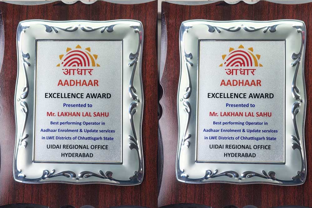 जिले के आधार सेवा संचालक श्री लखन लाल साहू को जिला अंतर्गत राज्य में Best performing Operator in Aadhaar Enrolment &Update services in LWE Districts of Chhattisgarh State यह पुरस्कार  UIDAI REGIONAL OFFICE HYDERABAD द्वारा 20 जून 2025 को रायपुर में आयोजित सम्मान समारोह में प्रदान किया गया।