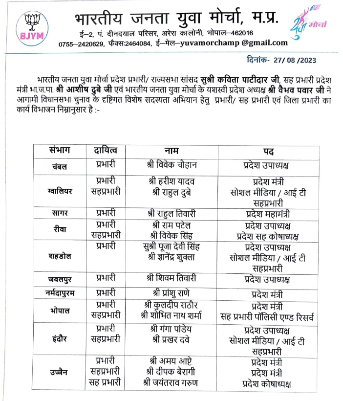 भोपाल। भाजयुमो प्रदेश की प्रभारी व भाजपा प्रदेश महामंत्री सुश्री @KavitaPatidar की सहमति से भारतीय जनता युवा मोर्चा के प्रदेश अध्यक्ष vaibhav pawar ने आगामी विधानसभा चुनाव के दृष्टिगत सदस्यता अभियान के संभागवार प्रभारी एवं सह प्रभारी एवं जिला प्रभारी नियुक्त किए हैं।