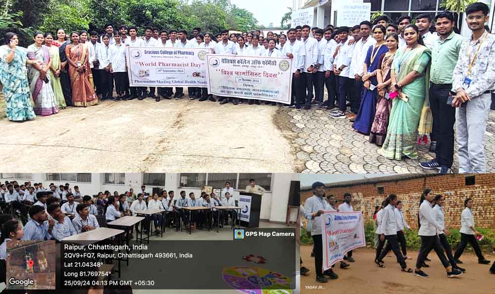 ग्रेसीयस फार्मेसी कॉलेज अभनपुर में विश्व फार्मासिस्ट दिवस 25 सितंबर 2024 के अवसर पर इस वर्ष विश्व फार्मासिस्ट दिवस के रूप में मनाया गया। इस दिन को मनाने का मकसद हेल्थ केयर की फील्ड में फार्मासिस्ट्स के अहम योगदान की सहारना और स्वास्थ्य और सुरक्षा के साथ-साथ समाज के कल्याण में सुधार के लिए जागरूकता बढ़ाना है।
