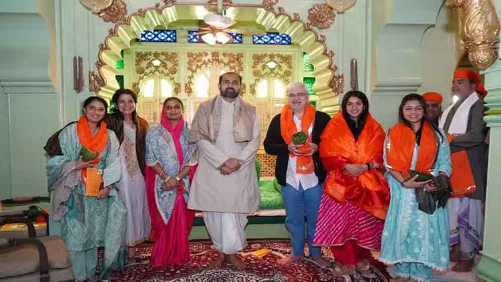 उद्योगपति मुकेश अंबानी की पुत्र वधु राधिका अनंत अंबानी ने श्रीनाथजी मंदिर में श्रीजी प्रभु के दर्शन किए। इस दौरान उन्होंने श्रीजी प्रभु शृंगार और राजभोग झांकी के दर्शन किए। दर्शन के दौरान राधिका अंनत अंबानी के पिता सुधीर मर्चेंट व माता सहित परिवार के सदस्य भी साथ में थे। दर्शन के बाद मंदिर परंपरानुसार तिलकायत पुत्र विशाल बावा ने राधिका अंबानी एवं उनके परिवार जनों का रजाई एवं ऊपरना ओढ़ाकर एवं प्रसाद भेंट कर समाधान किया। जानकारी के अनुसार, राधिका अंबानी अपने विवाह के बाद पहली बार श्रीजी प्रभु के द्वार आई और उन्होंने प्रभु के शृंगार एवं राजभोग की झांकी के दर्शन किए। इस अवसर पर राधिका अंबानी ने विशाल बावा एवं दीक्षिता बहू से श्रीजी प्रभु के राग, भोग, शृंगार एवं पुष्टि मार्गीय सेवा एवं प्रभु की लीलाओं के संदर्भ में भी चर्चा की। इस अवसर पर राधिका अंबानी ने विशाल बावा से पूरे परिवार के साथ जल्द ही श्रीजी प्रभु के दर्शन करने की इच्छा जताई। इस अवसर पर मंदिर के अधिकारी सुधाकर उपाध्याय, मंदिर के मुख्य प्रशासक भारत भूषण व्यास, तिलकायत मुख्य सलाहकार अंजन शाह, सहायक अधिकारी अनिल सनाढ्य, तिलकायत सचिव लीलाधर पुरोहित, पीआरओ गिरीश व्यास, समाधानी उमंग मेहता, गोवर्धन सनाढ्य, जमादार हर्ष सनाढ्य, कैलाश पालीवाल मौजूद रहे।