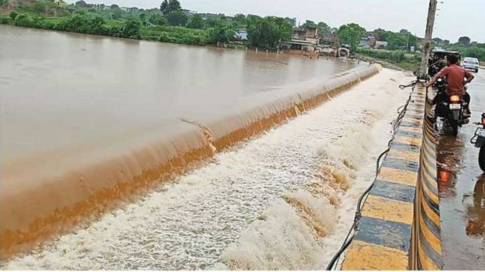 सीप नदी में उफान से बंजारा डैम ओवर फ्लो है। पुल के आधे पिलर डूब गए।