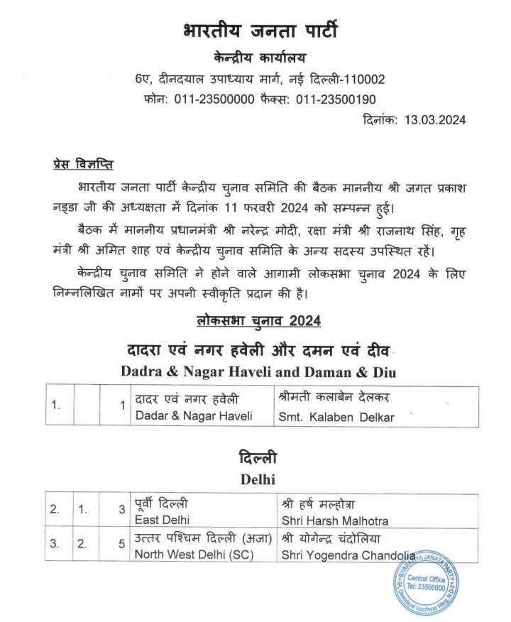 नई दिल्ली। लोकसभा चुनाव के लिए भाजपा ने अपनी दूसरी सूची जारी कर दी है। इस सूची में 72 उम्मीदवारों के नाम का एलान किया गया है। इसमें कई केंद्रीय मंत्रियों के भी नाम हैं। 72 उम्मीदवारों की दूसरी सूची में नागपुर से नितिन गडकरी और हमीरपुर से अनुराग ठाकुर को टिकट दिया गया है। एक दिन पहले हरियाणा के मुख्यमंत्री की कुर्सी छोड़ने वाले मनोहर लाल करनाल से चुनाव लड़ेंगे।