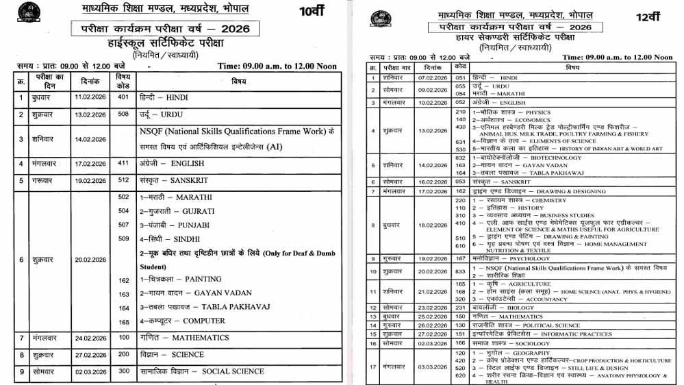 मध्य प्रदेश माध्यमिक शिक्षा मंडल की ओर से जारी टाइम टेबल के अनुसार, दोनों कक्षाओं का पहला पेपर हिंदी विषय का होगा। टाइम टेबल के अनुसार, 12वीं की परीक्षाएं 7 फरवरी से 3 मार्च 2026 तक चलेंगी। वहीं 10वीं की परीक्षाएं 11 फरवरी से 2 मार्च तक चलेंगी। परीक्षा का समय सुबह 9 बजे से लेकर 12 बजे तक निर्धारित है।