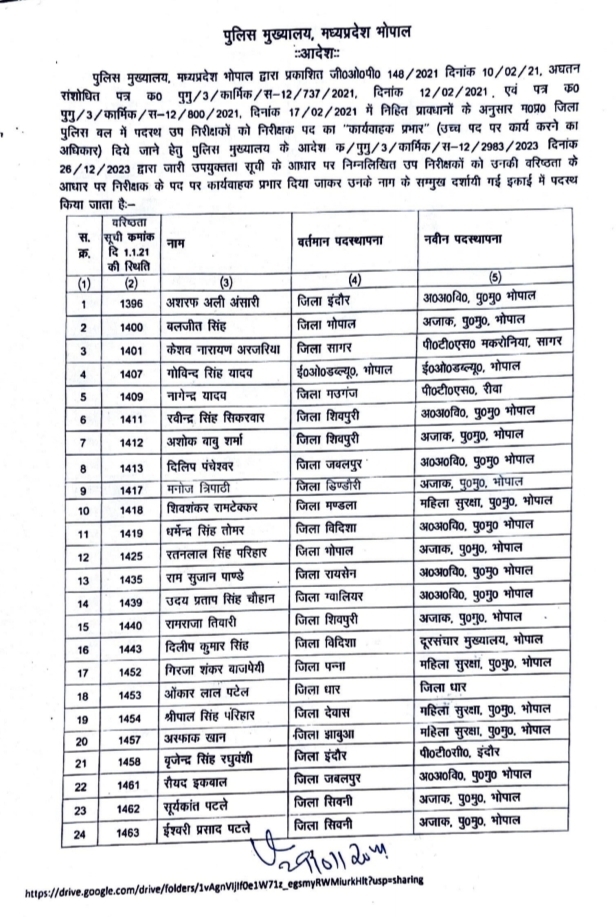 भोपाल। राज्य शासन ने 179 उप निरीक्षकों को पुलिस निरीक्षक का प्रभार दिया है। इस संबंध में पुलिस मुख्यालय ने आदेश जारी किए हैं।