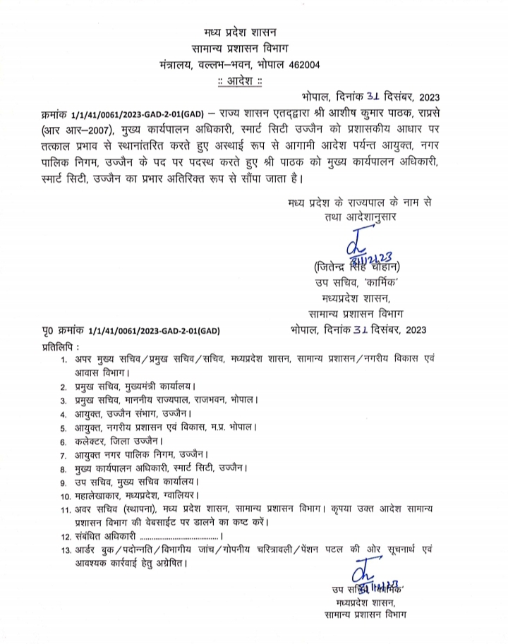 भोपाल। राज्य शासन के सामान्य प्रशासन विभाग ने रविवार रात्रि में जारी आदेश में राज्य प्रशासनिक सेवा के अधिकारी आशीष कुमार पाठक मुख्य कार्यपालन अधिकारी, स्मार्ट सिटी उज्जैन को स्थानान्तरित करते हुए आयुक्त नगर पालिक निगम, उज्जैन के पद पर पदस्थ करते हुए पाठक को मुख्य कार्यपालन अधिकारी स्मार्ट सिटी उज्जैन का प्रभार अतिरिक्त प्रभार सौंपा है।