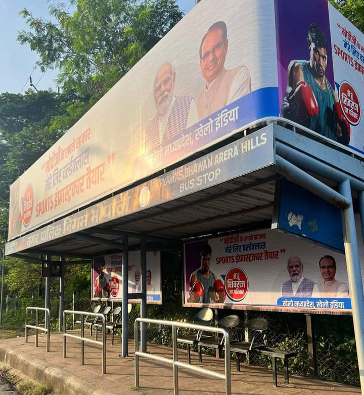 इन तीनों तरफ की दीवारों पर विशाल विज्ञापनों में मुख्यमंत्री और प्रधानमंत्री के मुस्कुराते फोटो लगे हुये थे।व्यापम चौराहे पर व्यापम दफतर की चढाई चढते ही नजर गयी उपर लगी विशाल गेन्ट्री पर जिसमें एक तरफ रास्तों के दिशा निर्देश होते हैं तो उसके बगल में विज्ञापनों के लिये बनी खाली जगह पर हंसती मुस्कुराती लाडली बहना योजना और मोदी शिवराज दिख रहे थे। सिर्फ एक चौराहे पर योजनाओं की इस कारपेट बॉम्बिंग के बीच थोडे आगे चले ही थे कि सामने दिखा एक बस स्टॉप मगर यहां भी वही योजनाएं और वही विज्ञापन ऊपर नीचे दायें और बायें अंदर बाहर। बस स्टॉप का छोटा सा कोना भी नहीं छूटा था जहां पर शिवराज सरकार के विज्ञापन की छाप ना दिख रही हो। इस बार के इस विज्ञापन में लाडली बहना नहीं बॉक्सिंग ग्लव्स पहनकर लाडला खिलाडी खडा था जिसका स्लोगन वही था मैं हूं शिवराज का परिवार।