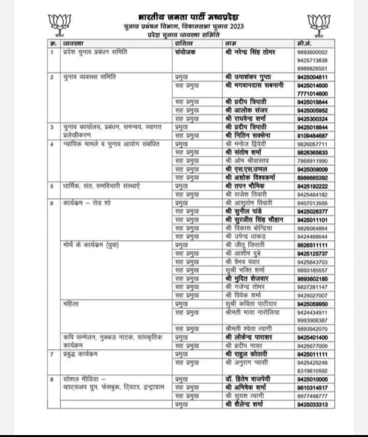 भोपाल। भारतीय जनता पार्टी ने प्रदेश में चुनाव को लेकर कई समितियों का गठन किया है। इन समितियों के प्रभारियों की सूची आज शाम जारी की गई है।