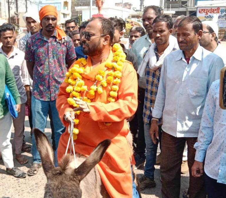 बुरहानपुर। आपने चुनाव के दौरान प्रत्याशियों को नामांकन दाखिल करने के लिए अपने समर्थकों के साथ रैली निकालते हुए देखा होगा। इधर बुरहानपुर में एक निर्दलीय प्रत्याशी गधे पर बैठकर नामांकन दाखिल करने पहुंचे। हिंदू संगठन के पदाधिकारी और निर्दलीय उम्मीदवार ठाकुर प्रियंक सिंह गधे पर बैठकर रिटर्निंग आफिसर के कार्यालय पर पहुंचे।