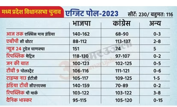 भोपाल। मध्यप्रदेश चुनाव को लेकर सर्वे एजेंसियां अपने एग्जिट पोल जारी कर दी हैं। यहां जानिए इनके अनुसार मध्यप्रदेश में किसकी सरकार बनने जा रही है। कोई बीजेपी को स्पष्ट बहुमत दे रहा है तो कोई कांग्रेस को। और कुछ एक्जिट पोल तो दोनों पार्टियों को बराबर सीटें दे रहे हैं। इन पर कितना भरोसा किया जाए, ये पूर्व में कर्नाटक और हिमाचल के चुनाव परिणाम खुद बता चुके हैं। हम खुद इन पर पूरी तरह भरोसा नहीं करते।