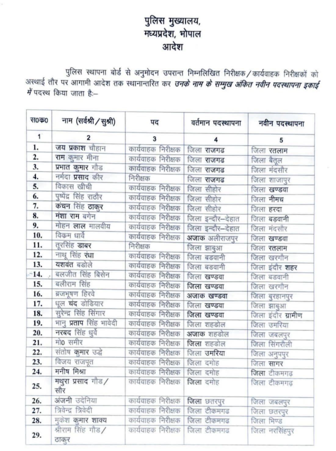 भोपाल। शासन ने नब्बे कार्यवाहक निरीक्षकों की पदस्थापना के आदेश जारी किए हैं।
