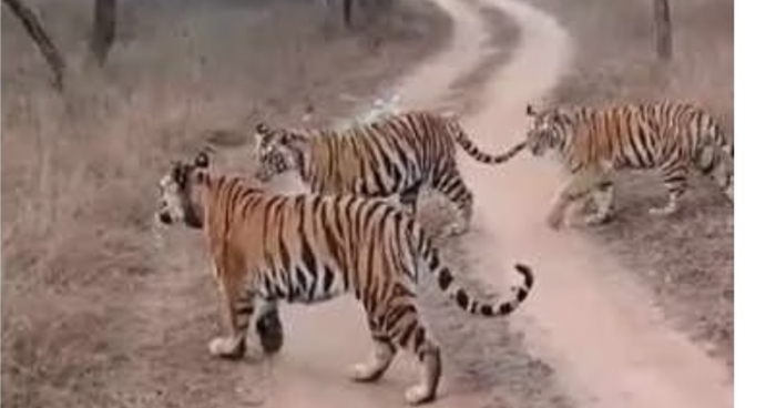 दरअसल, वायरल वीडियो पन्ना टाइगर रिजर्व का है। यहां भ्रमण के लिए जा रहे पर्यटकों के रास्ते में अचानक बाघ परिवार डेरा जमा कर बैठ गया, जिससे पर्यटकों की सांसें थम गई। भय और रोमांच के बीच पर्यटकों ने इसका वीडियो बनाया जो सोशल मीडिया में जमकर वायरल हो गया है।