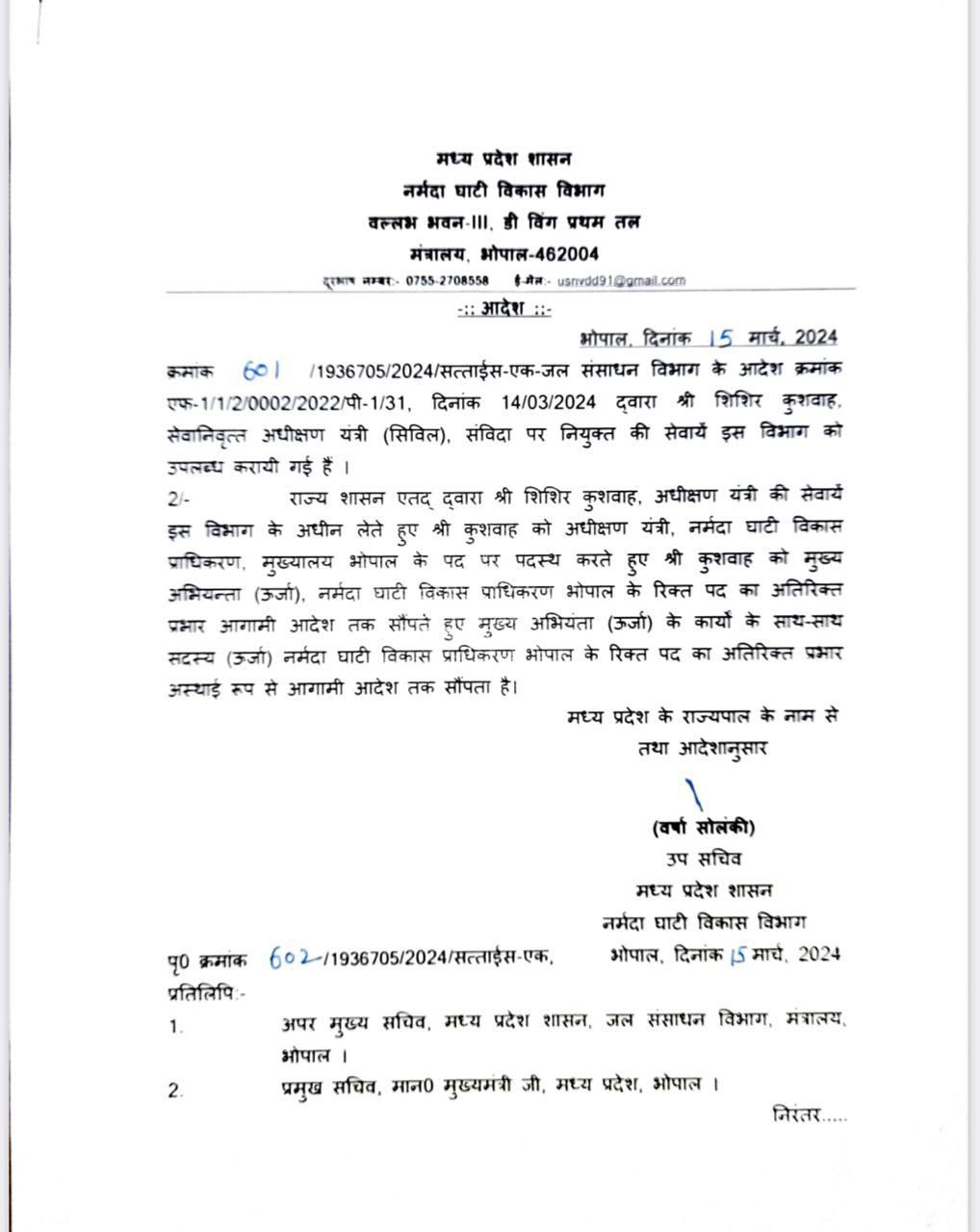 Bhopal। राज्य शासन ने सेवानिवृत्त अधीक्षण यंत्री शिशिर कुशवाहा को संविदा पर नियुक्ति प्रदान करते हुए नर्मदा विकास प्राधिकरण में सदस्य अभियंता बनाया है। एक अन्य आदेश के तहत श्याम सुन्दर कमाक राउत अधीक्षण यंत्री, कार्यालय मुख्य अभियंता, इंदिरा सागर परियोजना (नहरें) सनावद को अपने वर्तमान कार्यों के साथ-साथ अधीक्षण यंत्री, नर्मदा विकास मंडल क्रमांक-10 धार के पद का अतिरिक्त प्रभार अस्थाई रूप से सौंपा गया है।