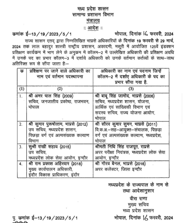 सामान्य प्रशासन विभाग द्वारा जारी आदेश में बताया गया है कि 19 फरवरी से 29 मार्च तक लाल बहादुर शास्त्री राष्ट्रीय प्रशासन अकादमी मसूरी में 125 वां इन्डक्शन प्रशिक्षण कार्यक्रम चलेगा जिसमें मध्य प्रदेश में पदस्थ भारतीय प्रशासनिक सेवा के चार अधिकारी भी शामिल होने जा रहे है, इसलिए उनका प्रभार दूसरे अधिकारियों को सौंपा जा रहा है।