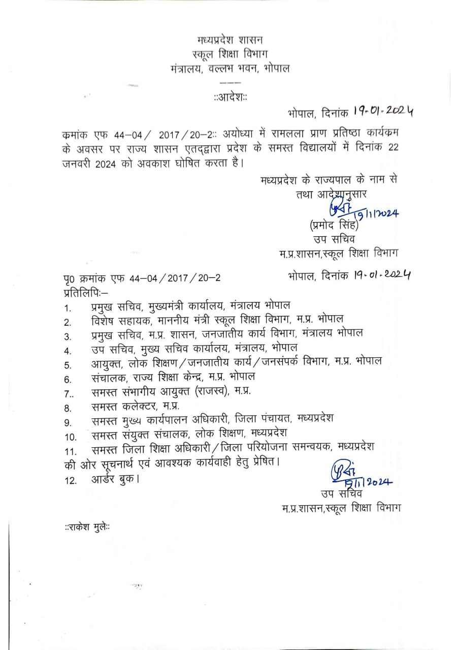 भोपाल। अयोध्या में श्रीराम मंदिर में रामलला की मूर्ति की 22 जनवरी को होने वाली प्राण प्रतिष्ठा के चलते प्रदेश के सभी स्कूलों में सोमवार को अवकाश रहेगा। इस संबंध में आज शाम को आदेश जारी किए गए हैं।