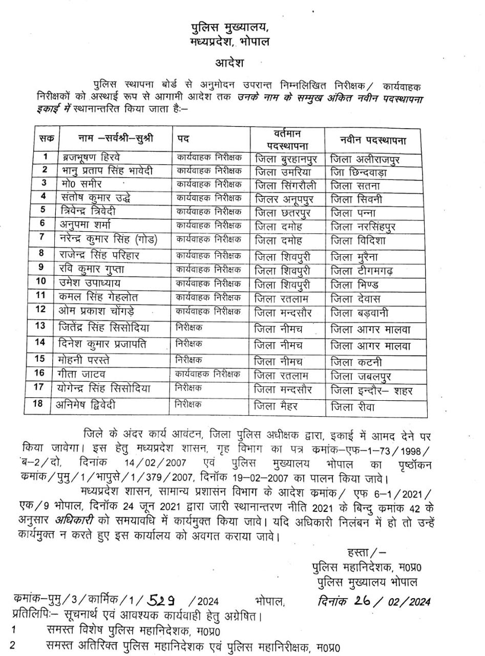भोपाल। पुलिस स्थापना बोर्ड की अनुशंसा पर आज डेढ़ दर्जन पुलिस निरीक्षक और कार्यवाहक निरीक्षकों के तबादला आदेश जारी किए गए हैं।