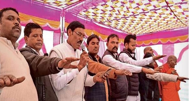 Shivpuri।करैरा तहसील के ग्राम बहगवां में भागवत कथा के भंडारे में पत्तल परोसने से रोका तो जाटव समाज के 40 परिवारों ने हिन्दू धर्म का त्याग करते हुए बौद्ध धर्म अपना लिया। हालाकि सरपंच का कहना है कि सभी आरोप निराधार हैं, ग्रामीणों को बहला फुसला कर उनसे बौद्ध धर्म स्वीकार करवाया गया है। जानकारी के अनुसार ग्राम बहगवां में गांव के लोगों ने चंदा कर भागवत कथा का आयोजन करवाया था। कथा के भंडारे से एक दिन पहले 31 जनवरी को जाटव समाज के 40 परिवारों ने अचानक से बौद्ध धर्म स्वीकार कर लिया और हिंदू धर्म का परित्याग करने की शपथ ली।