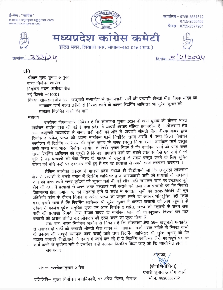 खजुराहो लोकसभा सीट से इंडिया गठबंधन के सपा प्रत्याशी मीरा यादव का आज नामांकन फॉर्म कलेक्टर पन्ना जो रिटर्निंग ऑफिसर हैं उनके द्वारा निरस्त कर दिया गया। नामांकन फार्म में सत्यापित मतदाता सूची का ना होना और नामांकन फार्म में हस्ताक्षर ना होने के चलते उनका नामांकन निरस्त कर दिया गया है। नामांकन निरस्त होने पर सपा पार्टी और कांग्रेसी लोग कलेक्ट्रेट पहुंचे।