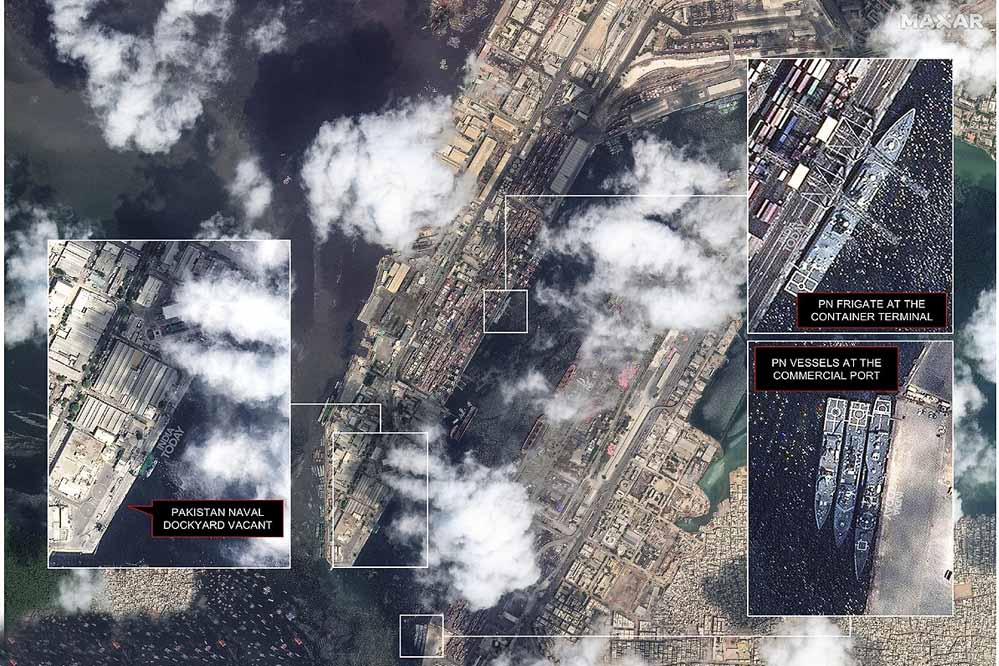 8 मई की कराची बंदरगाह की सैटेलाइट तस्वीर बताती है कि पाक नौसेना के युद्धपोत व्यावसायिक बंदरगाह और कंटेनर टर्मिनल पर खड़े थे.
