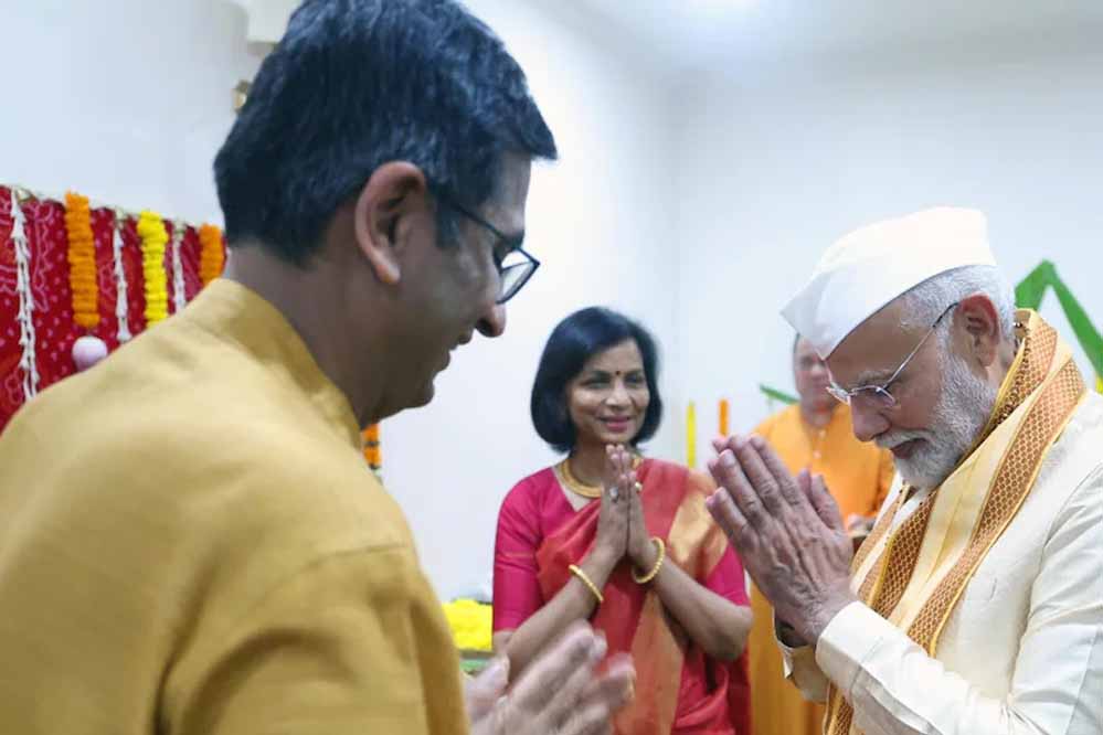 प्रधानमंत्री नरेन्द्र मोदी बुधवार को नई दिल्ली स्थित भारत के चीफ जस्टिस डीवाई चंद्रचूड़ के घर पर गणपति पूजा समारोह में शामिल हुए. प्रधानमंत्री नरेंद्र मोदी ने खुद इसकी जानकारी सोशल साइट X पर दी है. इस दौरान पीएम नरेंद्र मोदी सीजेआई डीवाई चंद्रचूड़ और उनकी पत्नी के साथ भगवान गणेश की आरती करते और पूजा करते नजर आए. प्रधानमंत्री ने पूजा करते हुए पारंपरिक महाराष्ट्रियन टोपी पहनी हुई थी. दरअसल, गणेश पूजा सबसे अधिक पॉपुलर महाराष्ट्र में है. इसलिए स्वाभाविक है कि पीएम मोदी ने महाराष्ट्रीयन टोपी को वरीयता दी होगी. सामान्य सी इस बात को लेकर सत्ता के गलियारों में कुछ लोगों को मिर्ची लग रही है. लगातार कुछ लोग दोनों के मिलने को भारतीय लोकतंत्र के लिए खतरा बता रहे हैं.