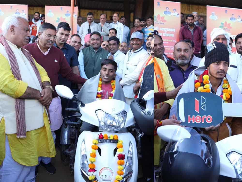 राज्य सरकार के एक वर्ष पूरा होने के उपलक्ष्य में आयोजित कार्यक्रमों की श्रंखला में आयोजित राज्य स्तरीय अंत्योदय सेवा शिविर कार्यक्रम का लाइव प्रसारण रविवार को खैरथल—तिजारा जिले में किया गया। कार्यक्रम में गृह राज्य मंत्री श्री जवाहर सिंह बेढ़म ने खैरथल-तिजारा जिले में प्रतीकात्मक रूप से मुख्यमंत्री स्कूटी योजना के चार दिव्यांगों को स्कूटी, 20 दिव्यांगों को ट्राई साइकिल, पांच दिव्यांगों को व्हीलचेयर, कालीबाई भील स्कूटी योजना के तहत पांच मेधावी छात्राओं को स्कूटी देकर वितरण की शुरुआत की।