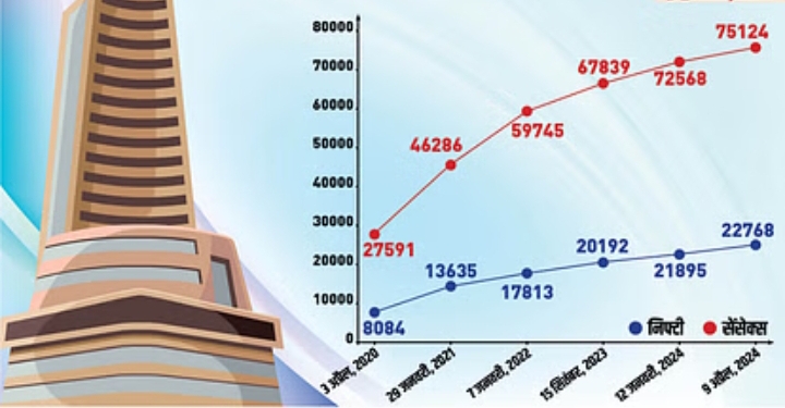मुंबई। भारतीय बेंचमार्क इंडेक्स मंगलवार को नए हाई पर खुले। आईटी और ऑटो सेक्टर में खरीदारी के कारण अमेरिकी बाजार में कमजोर रुख के बावजूद भारतीय बाजार में हरियाली दिखी। एसएंडपी बीएसई सेंसेक्स पहली बार 75,000 अंक के साथ 75,124 के नए शिखर पर पहुंच गया, जबकि व्यापक निफ्टी 50 ने 22,765 की नई ऊंचाई को छू लिया। दोनों सूचकांक 0.20% से अधिक की बढ़त के साथ कारोबार करते दिखे।