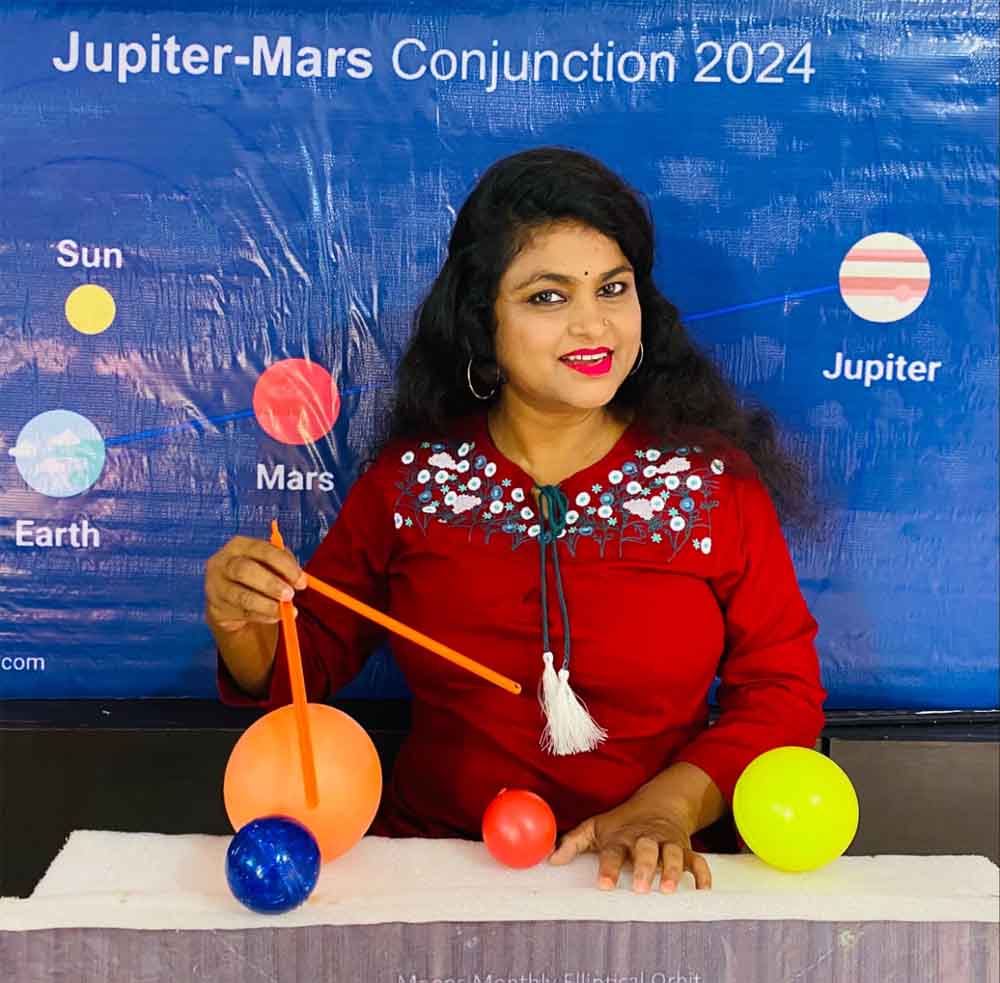 सारिका ने बताया कि जोड़ी बनाते इन ग्रहों में मंगल पृथ्वी से लगभग 22 करोड़ किमी से अधिक दूर होगा तो बृहस्पति 80 करोड़ किमी से अधिक दूर होगा । दूरी में इतना अंतर होते हुये भी पृथ्वी से देखने पर इनका कोण इस प्रकार होगा कि वे जोड़ी के रूप मे एक दूसरे मे समाते दिखेंगे ।