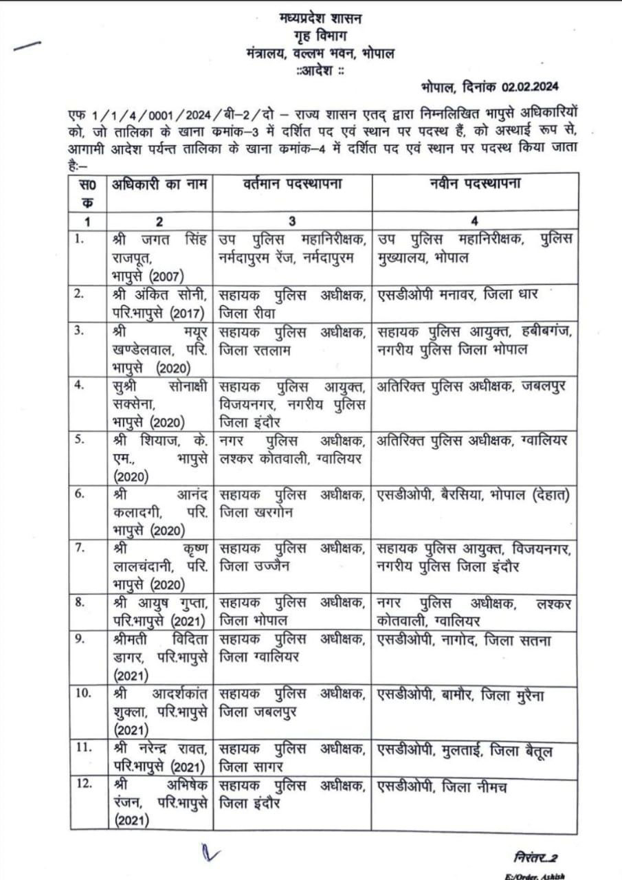 ग्वालियर के अतिरिक्त पुलिस अधीक्षक अमृत मीणा को पीएचक्यू भोपाल, जबलपुर के अतिरिक्त पुलिस अधीक्षक कमल मौर्य को उप सेनानी पांचवी वाहिनी विसबल मुरैना,मनोकामना प्रसाद अतिरिक्त पुलिस अधीक्षक राजगढ़ को पुलिस मुख्यालय भोपाल,इडला मौर्य एसडीओपी सैलाना को डीएसपी अजाक रतलाम, पंकज दीक्षित एसडीओपी बैरसिया को डीएसपी देहात भोपाल, धीरज बब्बर एसडीओपी मनावर धार को डीएसपी अजाक देवास,सुरेश पाल सिंह एसडीओपी मुलताई बैतूल को डीएसपी महिला सुरक्षा शाखा बैतूल, वीरेंद्र कुमार मिश्र सहायक पुलिस आयुक्त हबीबगंज भोपाल को डीएसपी पुलिस मुख्यालय, भोपाल, सुश्री दीपाली चंदोरिया एसडीओपी बामोर मुरैना को सहायक सेनानी 13वीं वाहिनी भी विसबल ग्वालियर, कृष्ण कुमार अवस्थी कार्यवाहक एसडीओपी जुन्नारदेव छिंदवाड़ा को कार्यवाहक सहायक सेनानी आठवीं वाहिनी भी विसबल छिंदवाड़ा, इंद्राज सिंह राजपूत कार्यवाहक एसडीओपी मऊगंज को कार्यवाहक डीएसपी जोन कार्यालय रीवा।