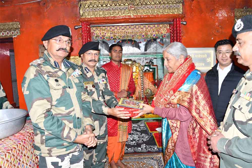इससे पूर्व केन्द्रीय वित्त मंत्री ने तनोट माता मंदिर परिसर में स्थित विजय स्तम्भ पर पुष्प अर्पित कर शहीदों को श्रद्धांजलि अर्पित की। यहां पर सीमा सुरक्षा बल की विशेष गार्ड द्वारा वित्त मंत्री को गार्ड ऑफ ऑनर प्रदान किया गया। वित्त मंत्री श्रीमती निर्मला सीतारमण ने विषम परिस्थियों में अपने कर्तव्यों का निर्वहन कर रहे सीमा सुरक्षा बल के बहादुर जवानों से बातचीत की व उनकी हौसला आफजाई की। उन्होंने कहा की देश की प्रथम रक्षा पंक्ति के रूप में विख्यात सीमा सुरक्षा बल के जवानों से मुलाकात कर उन्हे आज गर्व की अनुभूति हो रही है। मंदिर परिसर में पहुँचने पर एम एल गर्ग (महानिरीक्षक) सीमान्त मुख्यालय, सीमा सुरक्षा बल राजस्थान, योगेन्द्र सिंह राठौड़ (उप महानिरीक्षक) क्षेत्रीय मुख्यालय जैसलमेर (उत्तर), सुरेंद्र कुमार (समादेष्टा ) क्षेत्रीय मुख्यालय जैसलमेर (उत्तर) और 166 वी वाहिनी के (समादेष्टा) वीरेंद्र पाल सिंह द्वारा पुष्पगुच्छ भेंट कर उनका स्वागत किया एवं तनोट माता की तस्वीर स्मृति स्वरुप भेंट की।