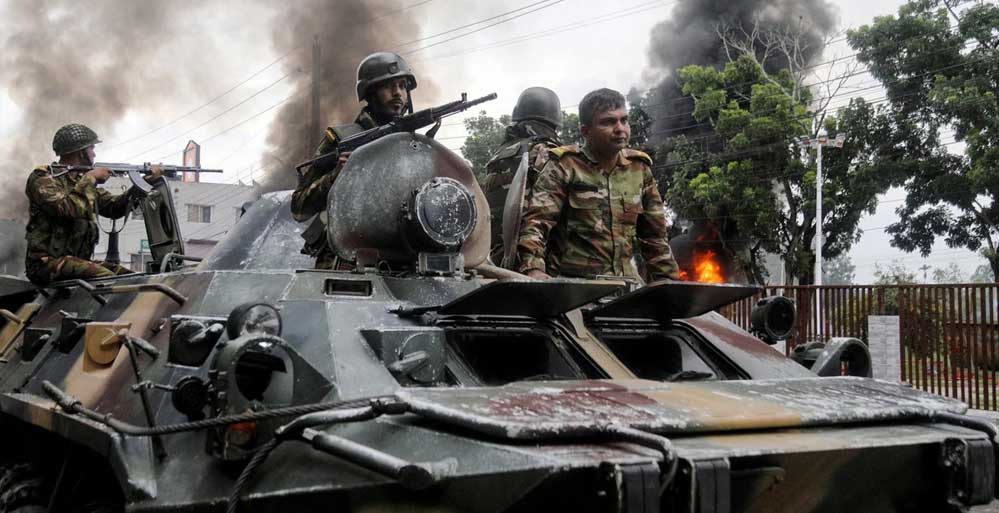 मीडिया रिपोर्टों और प्रत्यक्षदर्शियों के अनुसार बांस के डंडों और ईंट-पत्थरों से लैस प्रदर्शनकारियों की पुलिस और सेना और अर्धसैनिक बल बीजीबी सहित सुरक्षा बलों के साथ झड़प हुई.