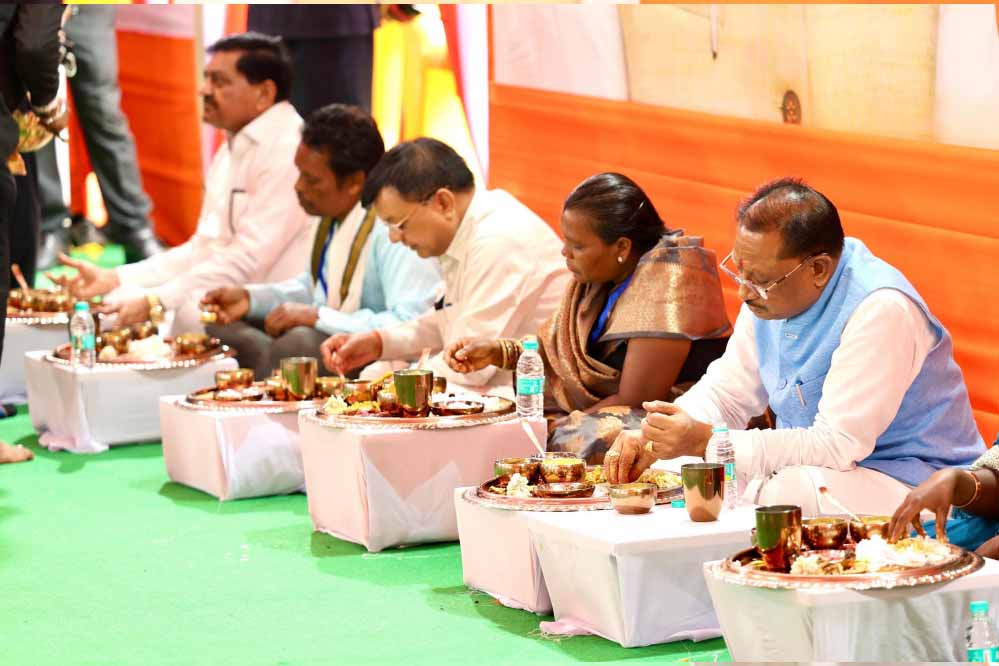 मुख्यमंत्री श्री विष्णु देव साय ने ‘आज मोर आवास-मोर अधिकार‘ कार्यक्रम के पश्चात प्रधानमंत्री आवास योजना के हितग्राहियों के साथ बैठकर भोजन किया। इस दौरान मुख्यमंत्री श्री साय ने साथ में बैठकर भोजन कर रही जशपुर जिले के कुनकुरी निवासी श्रीमती फुलजेन्सिया एक्का और फरसाबहार की श्रीमती कुसुम से चर्चा करते हुए उनका एवं उनके परिवार का कुशलक्षेम जाना। मुख्यमंत्री के साथ भोजन करने वालों में जशपुर के श्री राम, कबीरधाम के श्री दौलतराम व श्री लालाराम, बस्तर के श्री लाहेन्द्र सिंह और श्रीमती सोनामणि, मुंगेली के श्री महेश और श्री समारू साहू, कांकेर की श्रीमती पूर्णिमा पटेल, बलौदाबाजार की श्रीमती हेमिन ध्रुव, रायपुर की श्रीमती रामबती पुरैना और श्री जट्टासिंग शामिल थे।