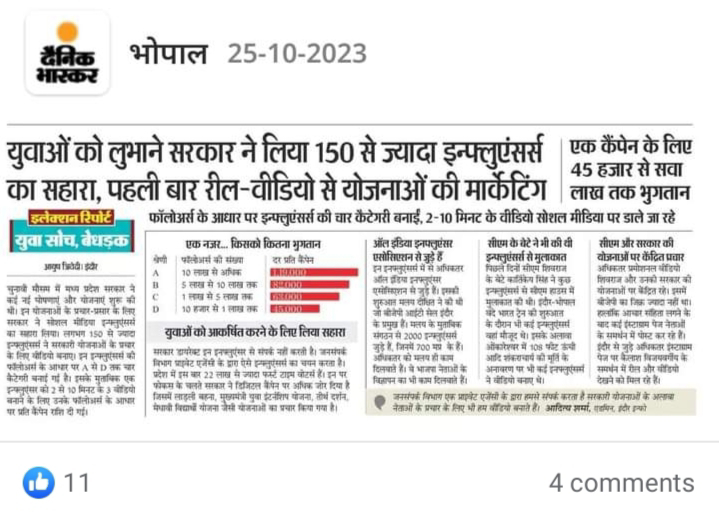 इतना सब हो रहा था और हो रहा है फिर भी इस मुद्दे पर काँग्रेस की चुप्पी? किस ओर इशारा करती है? भाजपा को राजनैतिक चन्दा सबसे ज्यादा मिलता है। यानि काँग्रेस चुनावी चन्दे में कमी के कारण फण्ड के लिये कमलनाथ पर ही ज्यादा निर्भर मानी जाती है? इसके बावजूद भाजपा के प्रचार में शासकीय धन और मशीनरी का उपयोग? ये एक बड़ा मुद्दा है लेकिन काँग्रेस इस पर चुप्पी साधे हुए है। और जो स्वतः व्यवस्था में बदलाव के लिए इन्फ्लुएन्सर बने हुए हैं, उनमें भी विपक्ष के इस बर्ताव से निराशा है।